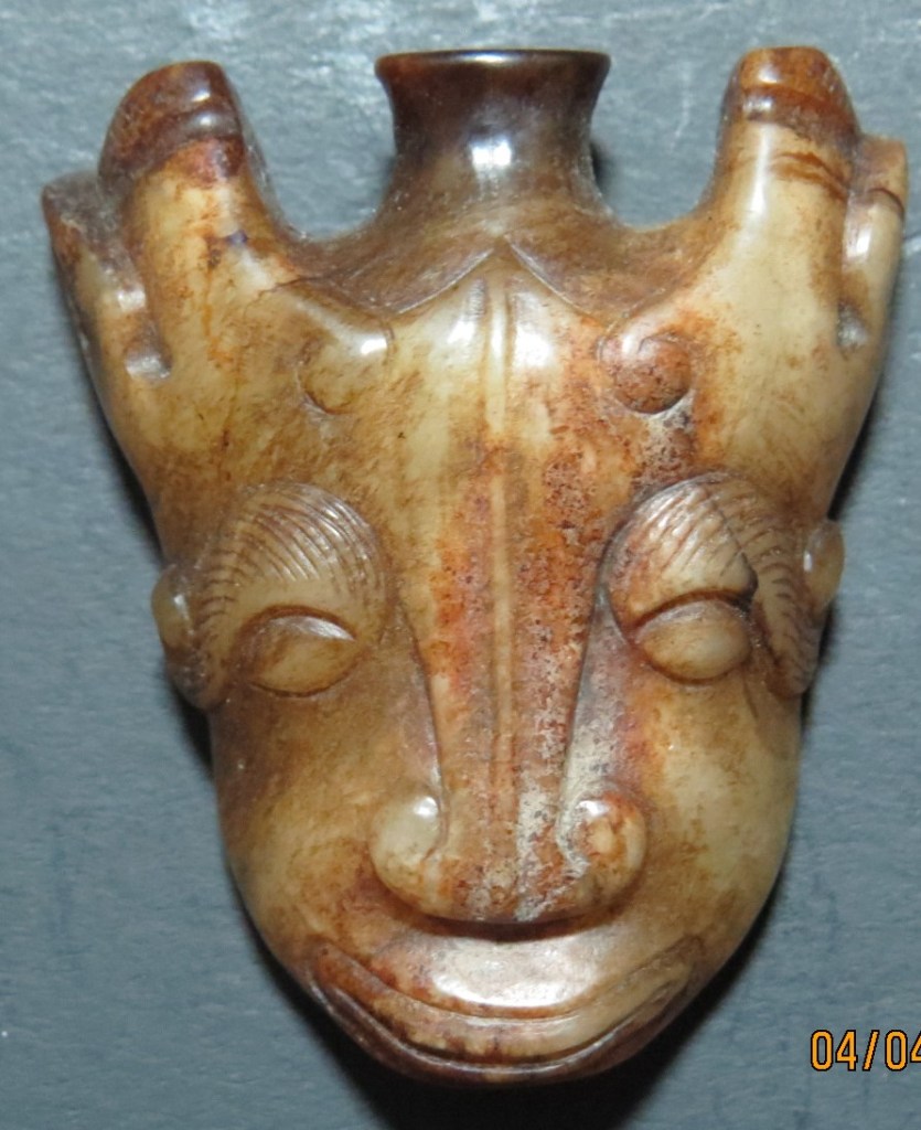 Xia mask previously cleaned with removal of the clay and ferruginous crust. The protonated layer and the patina color caused by the clay and ferruginous material in the surface micro pores cannot be cleaned.